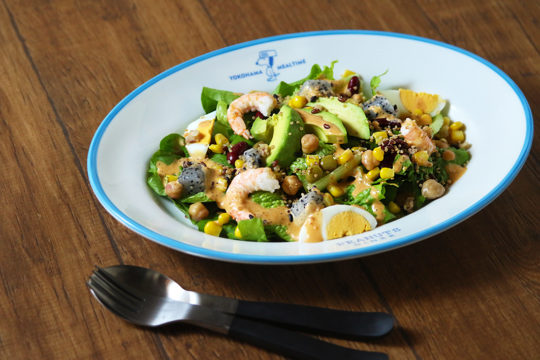 おしゃれさんのベルをイメージした健康志向のサラダボウル。エビやアボカド、ビーンズをコブサラダドレッシングで仕上げた。アクセントのドラゴンフルーツも美味しい、おしゃれさんのためのサラダボウル。