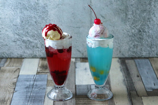 ソーダファウンテンはアメリカのレストランなどにある、コックをひねってソーダを出すマシーン。ダイナーではキャラクターをイメージしたかわいいフロートに仕上げた。