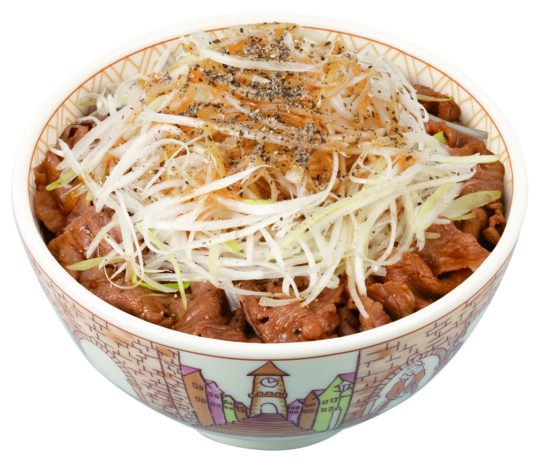 牛丼の上に細く切った旬の白ねぎをたっぷりのせ、ゴマ油が香る「すき家」オリジナルのタレと、ピリッと辛い黒胡椒で仕上げた。シャキシャキの白髪ねぎは、牛丼との相性抜群。