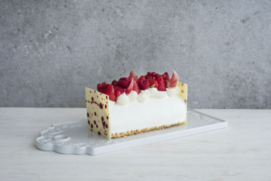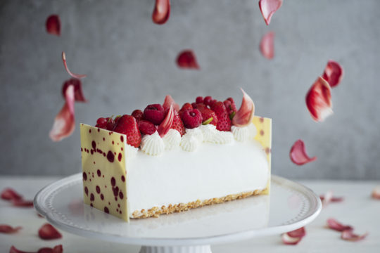 甘酸っぱいいちごやラズベリー、赤すぐり、花びらに見立てたチョコレートを、こぼれ落ちそうなほど贅沢にトッピングし、雪の上に降り積もる赤い花を表現した。