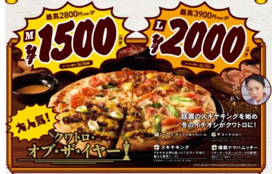 ・割引内容 : ご注文のピザを、Mサイズ1,500円(税抜)、Lサイズ2,000円(税抜)でお届けします。