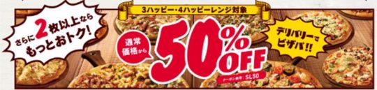 ピザ全品をMサイズ1,500円、Lサイズ2,000円でお届けするだけでなく、2枚以上の注文すると、通常価格から50%OFFになるキャンペーンも同期間中に実施。3ハッピー・4ハッピーレンジのピザを対象に、2枚以上を電話かオンラインで、クーポンコードを使いデリバリー注文すると、50%OFFになるお得なキャンペーン。