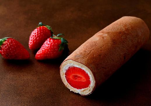 さらに海苔巻きに見立てたココア風味のクレープ生地で包んだ。上品な甘さの生クリームと甘酸っぱいフレッシュいちごが絶妙にマッチしたスイートな恵方巻き。