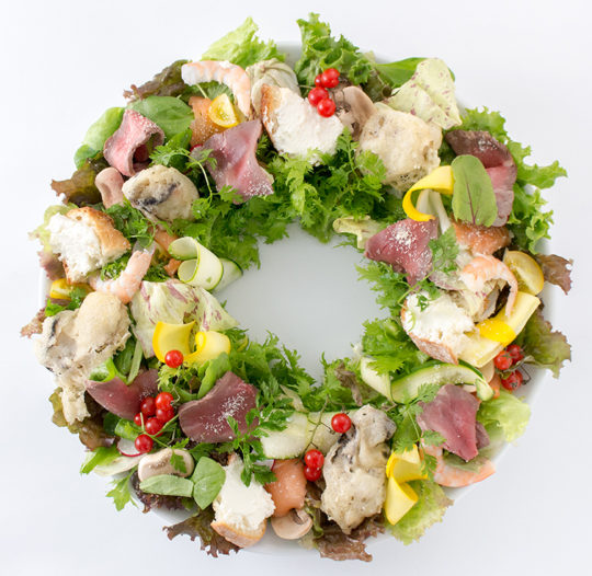 贅沢に14種類の食材を使い、“クリスマスリースサラダ”に仕立てた。