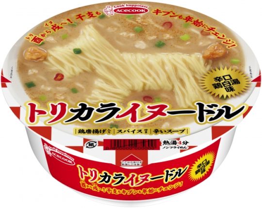 エースコック株式会社は、「トリ」年から「イヌ」年への年跨ぎをカップめんで表現しようと「トリカライヌードル 辛口鶏白湯味」を新発売する。