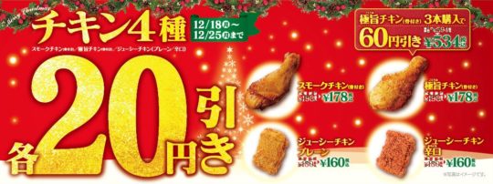 ミニストップ株式会社は、フライドチキン需要の最盛期となるクリスマスに向け、新たなチキンメニューとして好評の「スモークチキン(骨付き)」も対象とした、チキン4種各20円引きセールを、2017年12月18日(月)より8日間限定で、国内のミニストップにて実施する。