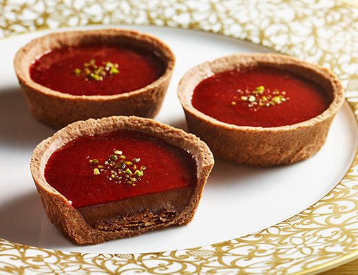 表面には赤いベリーソースを流し込み、上からピスタチオをトッピング、中には濃厚なチョコレートをタルトに敷き詰めた。食べた際にチョコレートの甘さとアクセントとしてベリーの酸味が味わえる商品。