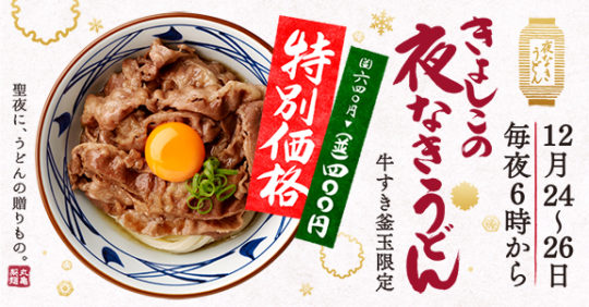 株式会社トリドールホールディングスグループが展開する讃岐うどん専門店「丸亀製麺」では、夜なきうどん企画 第6弾として、12月24日・25日・26日の3日間限定で、大好評の「牛すき釜玉」を特別価格で販売する。