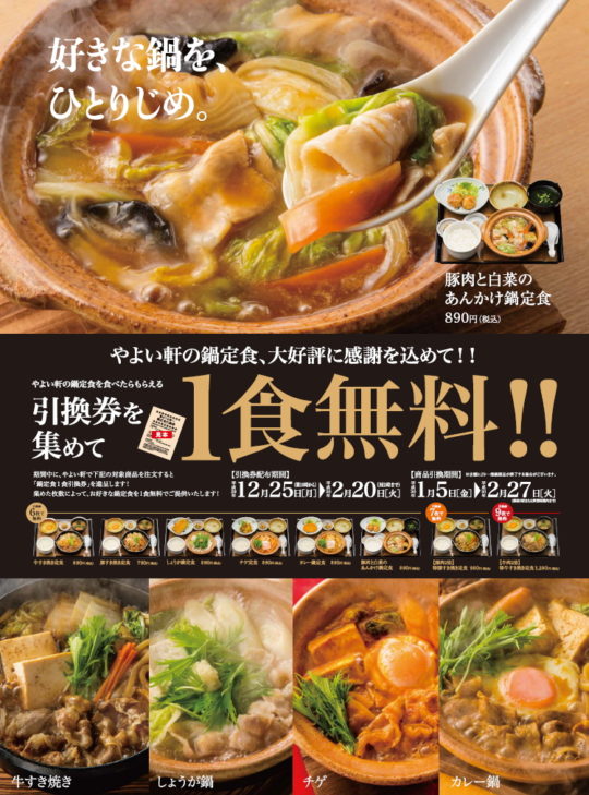 3.内容 「やよい軒」で下記の鍋定食を注文された際に、「鍋定食1食引換券」を1枚進呈。集められた引換券の枚数によって、お好きな鍋定食を1食無料で提供。