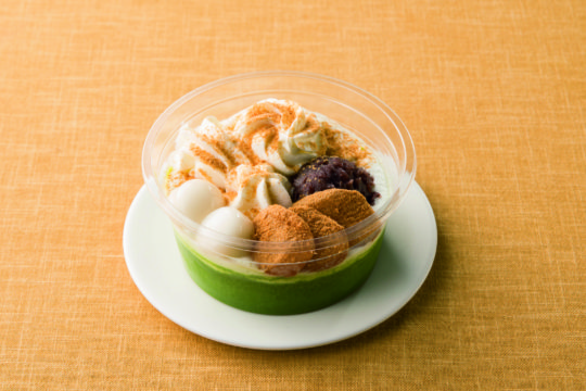 ◆特長 :わらび餅や白玉、あんこを使用した和風のシェアスイーツ。宇治抹茶のババロアの上にわらび餅と白玉、粒あんを盛り付け、ホイップクリームにきな粉をまぶした抹茶ときな粉の「和」の味わいを楽しめる商品。