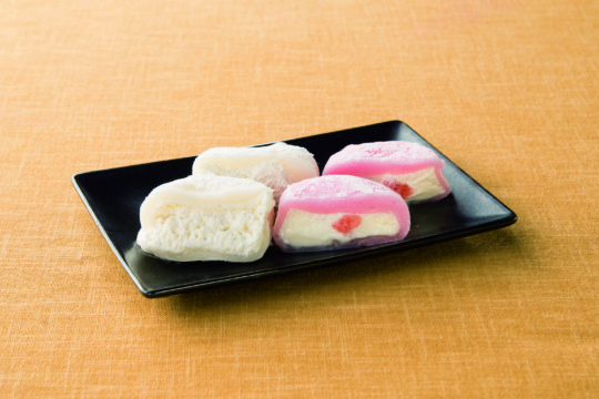◆特長 :赤い洋風大福は、相性のよい練乳クリームと苺ソースを、白い洋風大福は、コクのあるバニラクリームを口の中でやわらかくとろけるもち生地で包んだ。