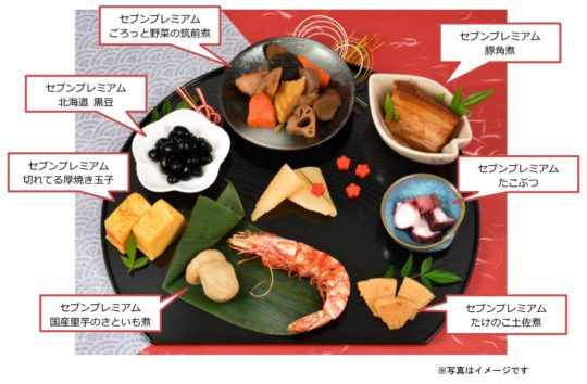 使用する「セブンプレミアム」は、おせち料理の定番である縁起の良い意味を持つ具材を中心とした『セブンプレミアム 北海道黒豆』や『セブンプレミアム 国産里芋のさといも煮』のほか、コリコリとした食感が楽しめる『セブンプレミアム たこぶつ』等7品。