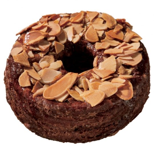 フライしたココア風味のクロワッサン生地にビターショコラクリームをサンドし、表面をグレーズでコーティング。シュガーとスライスアーモンドをトッピングし、オーブンでサクサクに焼き上げた。キャラメリゼしたような香ばしさを楽しめる一品。