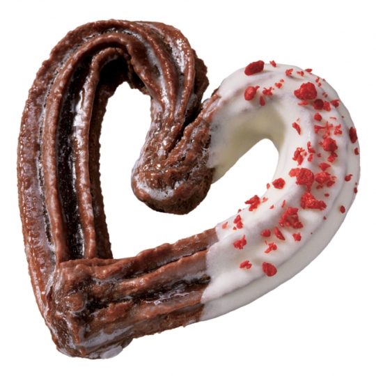 ココア風味のチュロ生地をハート形に成形し、ローズフレーバーのグレーズをコーティング。ホワイトチョコとストロベリークランチでデコレーションした。