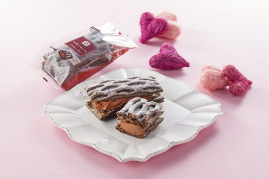 ・専用工場で焼き上げたサクサクとしたパイで挟んだ。