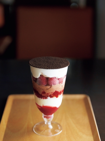 「ラズベリーショコラパフェ」は、カップのフチで平らに仕上げた上からココアパウダーをふんだんに振りかけ、その下には冷凍ラズベリーにショコラムース、程良い酸味のラズベリーソースとサクサクのフィヤンティーヌなどが幾重にも重ねられ、食べ進めるほどに美味しさと食感が楽しめるよう工夫されている。