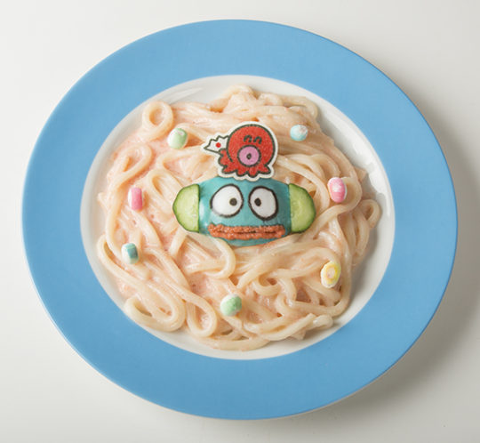 おしゃれなペンギンの男の子「タキシードサム」がホワイトソースにビーツを加えたピンクのクリームシチューに浸かって顔を覗かせた「タキシードサムのぶくぶく浸かりシチュー」や、カミナリの国で生まれた「ゴロピカドン」の頭をふわふわの綿あめで表現、中にはパンケーキが隠れた「ゴロピカドンのカミナリパンケーキ」、中国生まれの半魚人「ハンギョドン」が明太子カルボナーラうどんに出現した「カルボナーラハンギョうどん」など、6つのキャラクターが、キュートなメニューに大変身。
