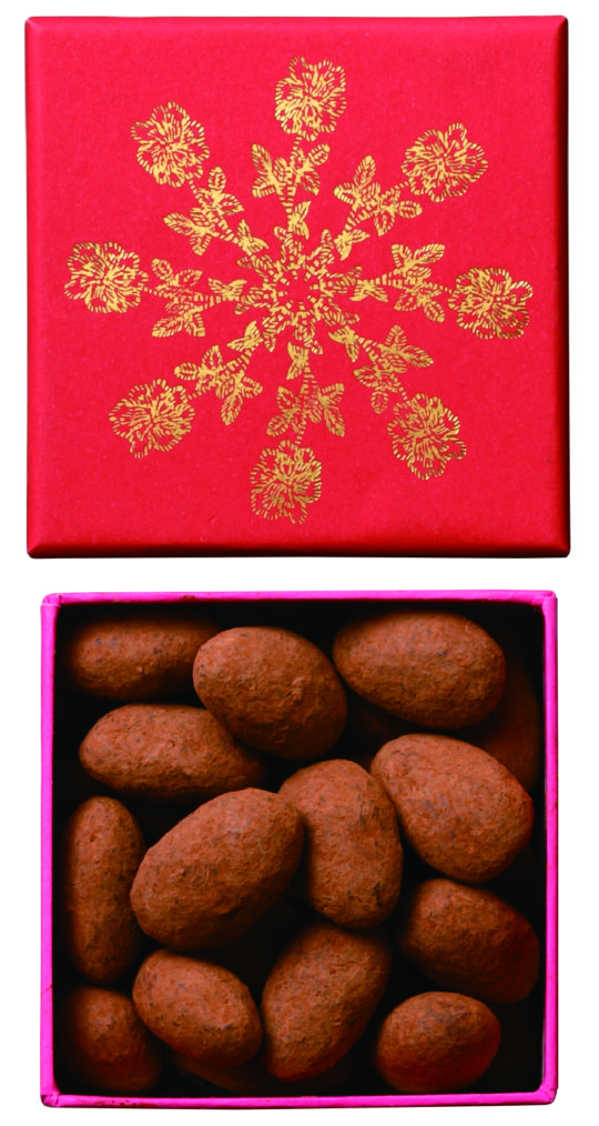 商品特長:プラリネにキャンディーコートしたナッツをトッピングして、 スウィートチョコレートとミルクチョコレートでそれぞれコーティングした。