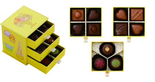 商品特長:バレンタインのオリジナルチョコレートを中心に、引き出し型のボックスに詰合せた、華やかなアソートボックス。