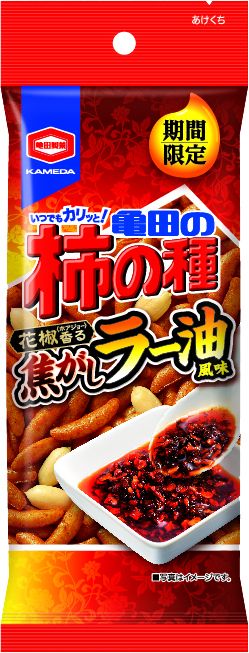 『亀田の柿の種焦がしラー油風味』は香ばしい焦がしラー油の味わいをイメージし、ラー油を加えた特製しょうゆだれにローストガーリックの風味を加えた食欲をそそる味わいが特長。