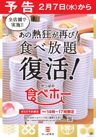コロワイドグループのかっぱ寿司は、2018年2月7日(水)より、昨年より好評を博している人気イベント『食べホー』が全店舗で復活する。