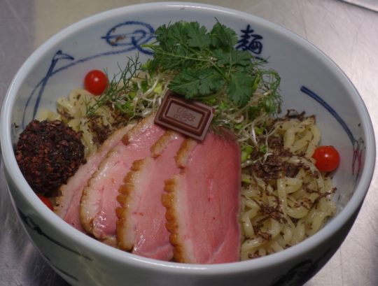 麺には、ガーナミルク1かけ、ふんだんにふり掛けたトリュフ、鴨肉、カカオ二ブ等をまぶした卵ボール、ウイキョウを中心とした野菜類をトッピング。 麺にもトリュフオイルをまぶし香り豊かに仕上げた。