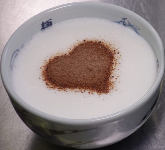 つけ汁は、ガーナミルク0.7枚と牛コンソメベースのスープに、香味野菜をあわせた、酸味が特長のスープ。さらに、昆布で出汁を取った牛乳をムース状にして演出しており、見た目だけでなくおいしいアクセントになっている。凍らせたガーナミルクを細かく粉砕し、バレンタインらしくハートにかわいらしくトッピング。
