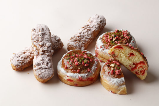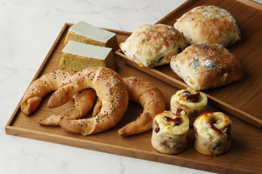 また、鮮やかでジューシーな「グレープフルーツのタルト」、キャラメリゼしたパイ生地にカスタードクリームと苺をはさんだ「ミルフイユ・オゥ・フレーズ」など、フルーティーで魅惑的な味わいの春のスイーツと、クルミをアクセントに加え、クランベリーとクリームチーズをたっぷり入れたパン「クランベリー&チーズ」、抹茶と大納言を口溶けの良いブリオッシュの中に詰め込んだ「抹茶のガトーブリオッシュ」など、春のおもたせにぴったりなブレッドも販売する。