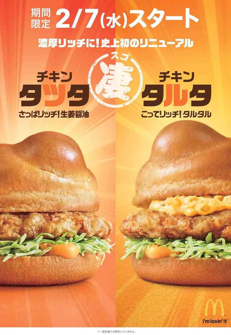日本マクドナルド株式会社は、長年愛顧いただいている「チキンタツタ」を、発売27年目にして初のリニューアルをし、より濃厚リッチに生まれ変わった“凄”「チキンタツタ」と、昨年初登場した「チキンタルタ」も“凄”「チキンタルタ」にリニューアルし、2月7日(水)から全国のマクドナルド店舗にて期間限定で販売する。また、今年は史上初「朝マック」にも登場する。さらに、初のリニューアルを記念して渋谷の4店舗にて両商品を2月1日(木)より先行販売を開始する。