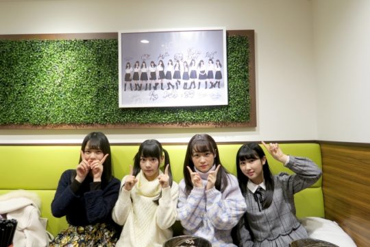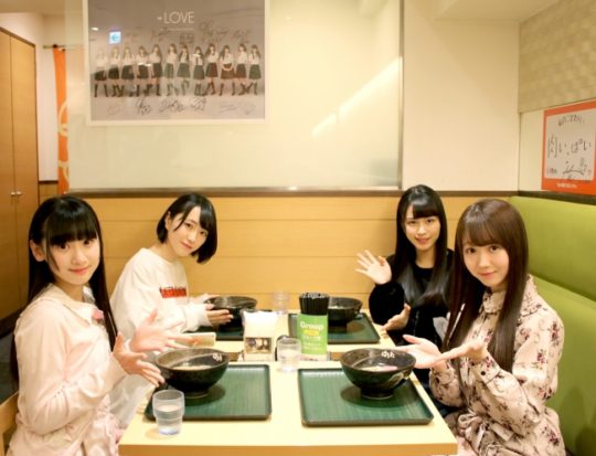 =LOVEのメンバーがバレンタインうどん販売店舗に来店し「バレンタインうどん」を試食した。