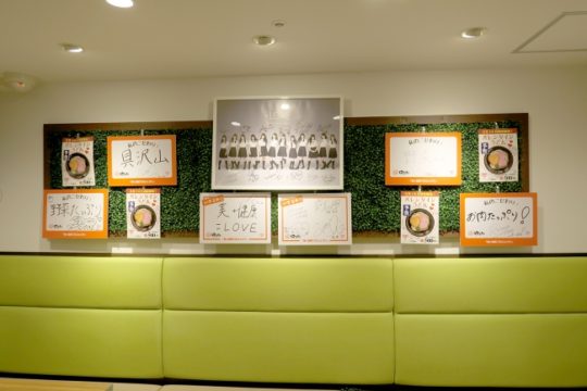 「美と健康プロジェクト記者発表会」時に使用しました直筆サインやメッセージボード等をバレンタインうどん販売店舗限定で特別ディスプレイを展示している。