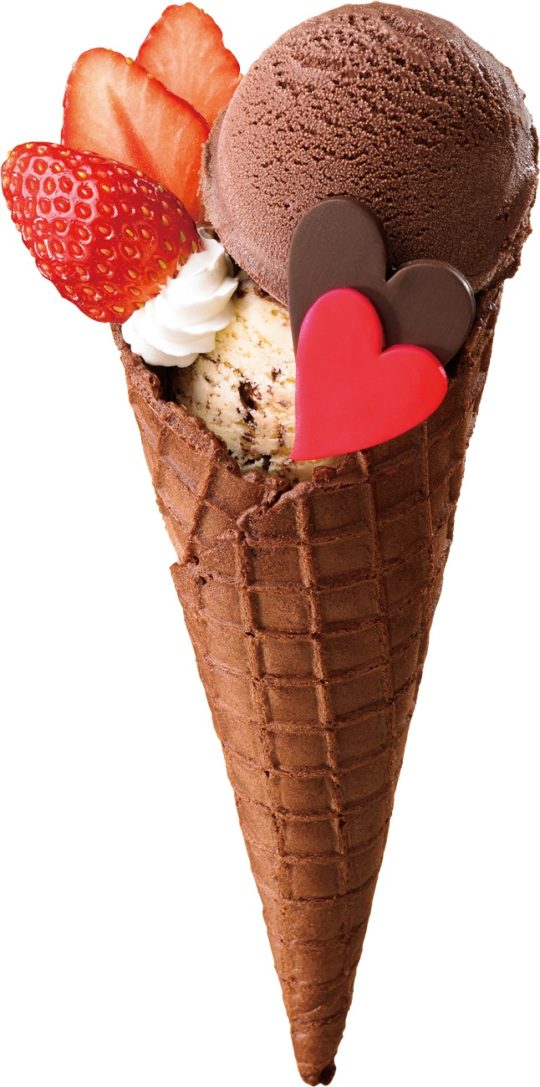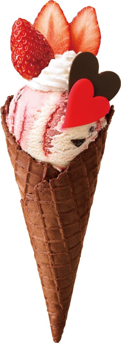 サーティワン初のココア生地のワッフルコーンに、好きなアイスクリームを入れ、生いちご、ホイップ、赤と茶色のダブルのハートを飾ったオトナかわいいサンデー。