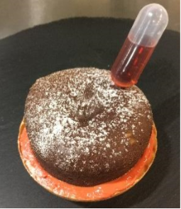 幸せを意味するオレンジ色のチョコレートの上にフォンダンショコラをのせて。パイに沿ったオレンジの輪で 永遠の幸せを表現。