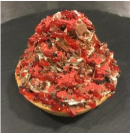 人気のスイーツパイをバレンタインスタイルに。ヘーゼルナッツクリーム(ヌテラ)とバナナ、生クリームの上にチョコレートやベリーソースなどをかけ、燃え上がる愛の炎をイメージ。