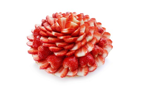 みずみずしく甘い鮮やかな赤色の果肉が特徴的な人気品種。優しい甘さの練乳いちごムース、生クリームとともに飾り付けたキュートなデザイン。