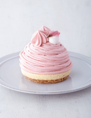 ■商品説明:まろやかな白あんミルクムースの上に、ほんのり桜が香る口どけのよいバタークリームを絞った桜色のモンブラン。白あんミルクムースの中心には、梅と苺のジュレを入れ、さっぱりとした酸味がアクセント。土台には、桜の葉の刻みを混ぜ込み、全粒粉を配合したシュトロイゼル※を使い、ザクザクとした食感と桜の葉の香りが楽しめる。上には、桜の花をイメージして絞ったクリーム、ほのかな塩味の桜の花も飾り、桜づくしのスイーツ。お花見や春の手土産におすすめ。※シュトロイゼル・・小麦粉、バター、砂糖などを混ぜてそぼろ状にしたもの