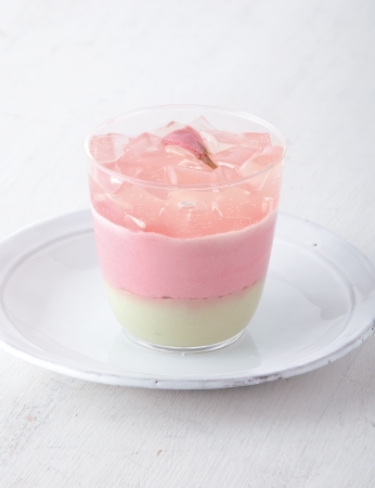 ■商品説明:桜の花と葉をイメージした淡いピンクとグリーンを層にしたベリーヌ。下から、やさしい味わいのピスタチオのムース、桜の花と葉の塩漬けペーストを加えたチェリームース、桜の香りの白ワインジュレの層になっている。上にはほのかな塩味の桜の花も飾った。お花見や春の手土産におすすめ。