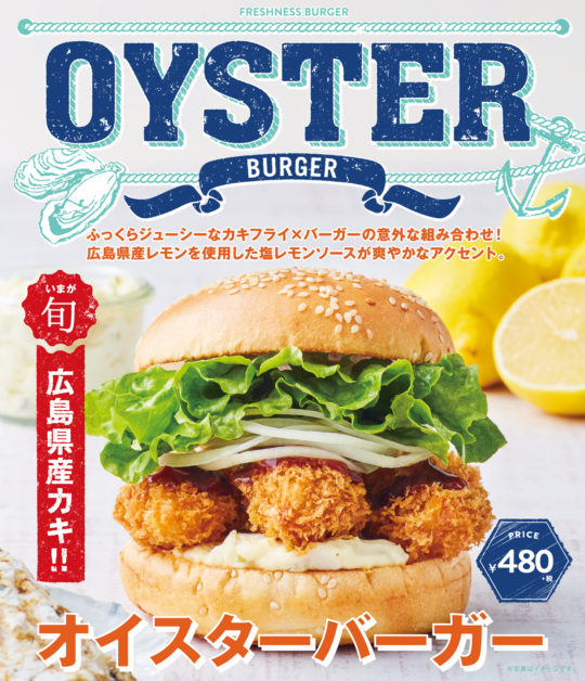 「オイスターバーガー」は、全国チェーンでは初めて(※当社調べ)「牡蠣フライ」をサンドした、今まであまりメジャーで無かった意外な組み合わせのバーガー。広島県産の牡蠣を使用したふっくらジューシーな「牡蠣フライ」をサクッと揚げ、広島県産のレモンを使用した「塩レモンソース」、「タルタルソース」、「とんかつソース」、「スライスオニオン」、「グリーンカール」をサンドした一品。ジューシーな「牡蠣フライ」とバーガーは驚くほど相性が良く、塩レモンソースが爽やかなアクセントとなり、一口食べるとクセになる味わい。