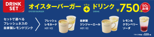 牡蠣とレモンの組み合わせを気軽に試してもらえるよう、オイスターバーガーとレモンを使用したドリンクをお得に楽しめるセットも販売する。対象となるドリンクは、フレッシュレモネード(HOT/ICE)、自家製ジンジャーエール(HOT/ICE)、レモン&クランベリーソーダ。どのドリンクも店内でレモンをスライスし、はちみつで漬けた「はちみつレモン」を使用している。フレッシュレモネードではレモンのスライスがたっぷり10枚入っている。爽やかレモン系ドリンクと「オイスターバーガー」の組み合わせで美味しく、効率的に栄養を摂取できる。