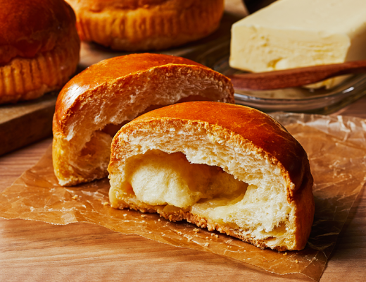 ザクザク食感のビスケット生地を敷いたメロンパン。塩味のあるバター入りクリームを染み込ませ、バターの味わい豊かなジュワッとした食感と、ザックリ食感が特徴。表面にはたまごを塗り、つや感のある新しい見た目のメロンパン。
