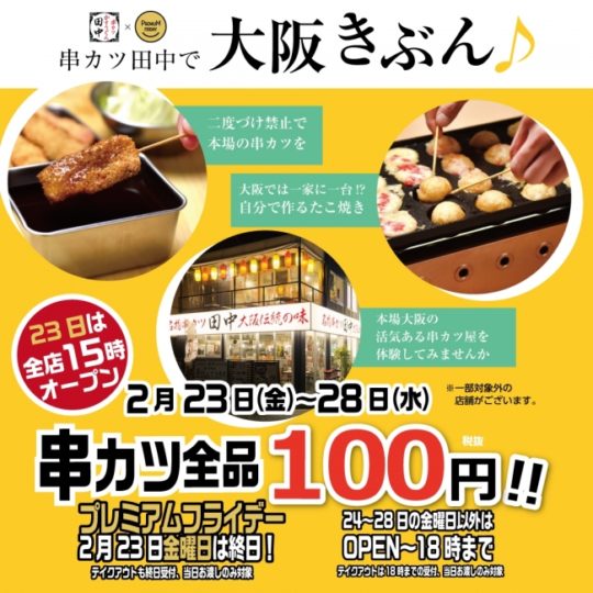 株式会社串カツ田中は、2018年2月23日(金)は15時からほぼ全店OPENし「月末金曜、何しよう?串カツ田中で大阪きぶん♪」を実施する。