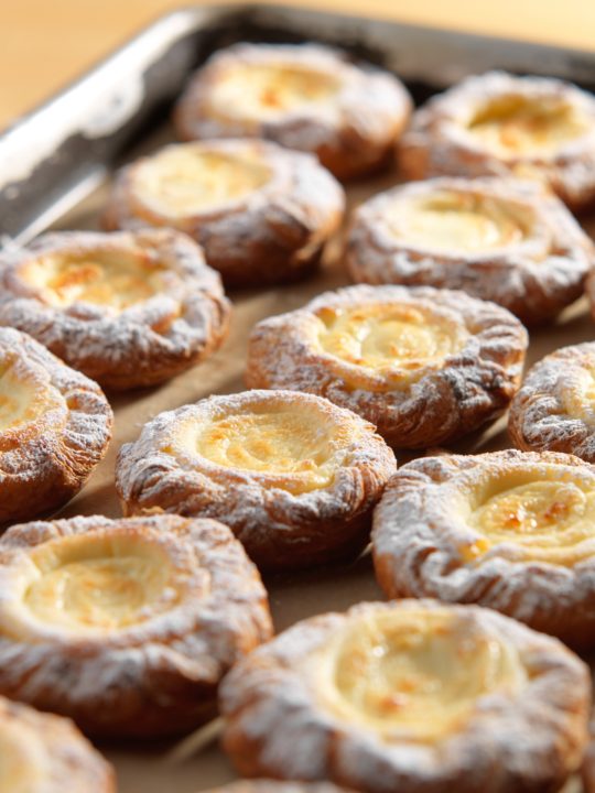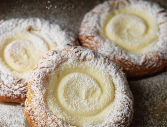 デニッシュ生地には北海道産100%の小麦、自家製天然酵母(白樺樹液×椿酵母)を使い、72時間かけて低温熟成発酵させ、27層に折り上げている。心地よいザクザクとした食感と、小麦の香りを感じられるデニッシュ。