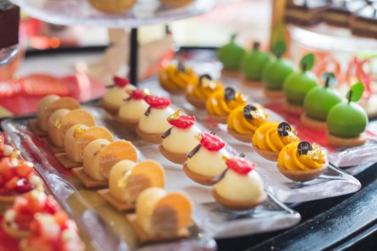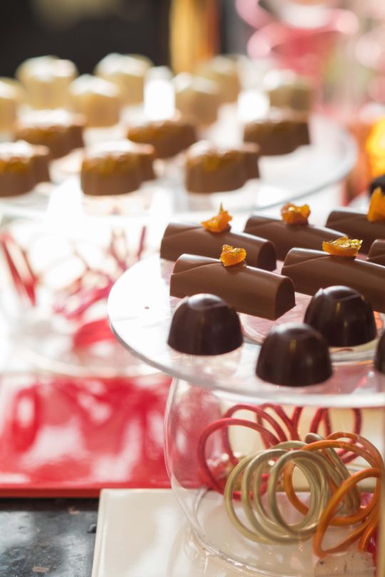 ガストロノミー “ジョエル・ロブション”のコースを締めくくる小菓子のワゴ ンは、季節の小菓子を好きなだけ楽しめる贅沢なデザートワゴン。季節ごとに華やかな飾りつけが施されたワゴンの上には、一口サイズの鮮やかなマカロンをはじめ、チョコレートやタルトなど20種類以上の小菓子が並ぶ。4月より、カラフルで楽しいイースターの装いを予定している。