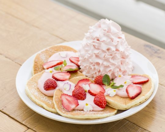 『レアレアパンケーキ~Spring Flower~』は人気のストロベリークリームチーズソースとフレッシュなイチゴをたくさんのせ、淡いピンク色のストロベリーホイップクリームを添えた、苺づくしのパンケーキ。エディブルフラワーを全体にあしらい、春らしく華やかなイメージを加えた、この期間だけのスペシャルなパンケーキ。(※花びらの種類は時期によって異なる場合あり)