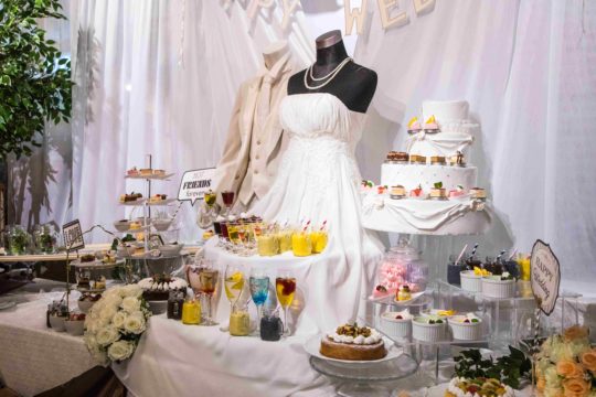 「ウエディングパーティ」をイメージしたとびきりフォトジェニックなビュッフェ台に並ぶ、色とりどりのスイーツをお楽しみください。