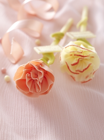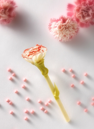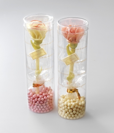 繊細な花びらが幾重にも重なるカーネーションをホワイトチョコレートで表現した。花びらを、苺風味パウダーでほんのりピンクに色づけした“ホワイト”と、苺風味で優しい色合いに仕上げた“ピンク”の2種類を用意。“ホワイト”には「Mother’s day」、“ピンク”には「お母さんありがとう」のメッセージが入っており、土台の部分はサクサクとした粒状チョコレートを敷いている。
