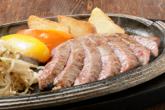 看板メニューと最高ランクのステーキが両方味わえるぜいたくな1皿。180グラムのハンバーグと100グラムのステーキでボリューム満点。