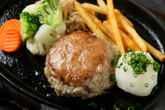 ※ハンバーグ、ハンバーグとステーキのコンボ、ステーキの価格はランチタイム「税込」、ディナータイム「税別」での表記。