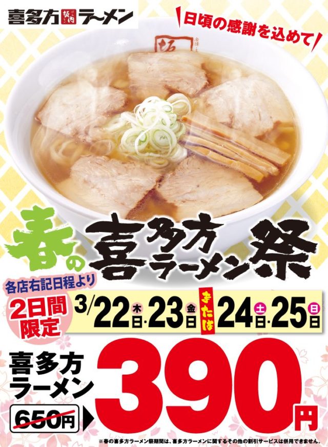 60年も続く福島県喜多方市の老舗繁盛店「坂内食堂」を本店に持ち「喜多方ラーメン坂内」FC事業を展開する、株式会社麺食は、創業30周年の感謝の気持ちを込めて、「喜多方ラーメン」650円を390円で販売する『春の喜多方ラーメン祭』を、3月22日(木)・23日(金)と24日(土)・25日(日)の各店舗いずれか2日間限定で開催する。