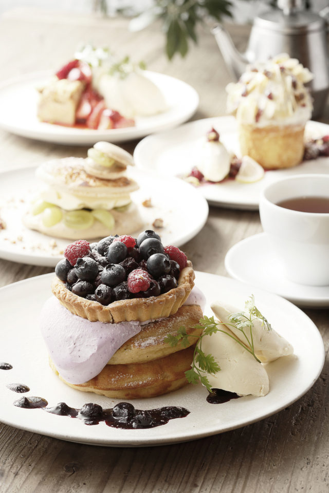 サクサクなタルトと自慢のふわもちパンケーキのハイブリット。たっぷりのブルーベリー、ブラックベリー、フランボワーズのタルトに甘酸っぱいブルーベリークリーム、ソースと、ブルーベリー尽くしのパンケーキ。春にピッタリな爽やかなブルーベリーの味わいが楽しめる一品。